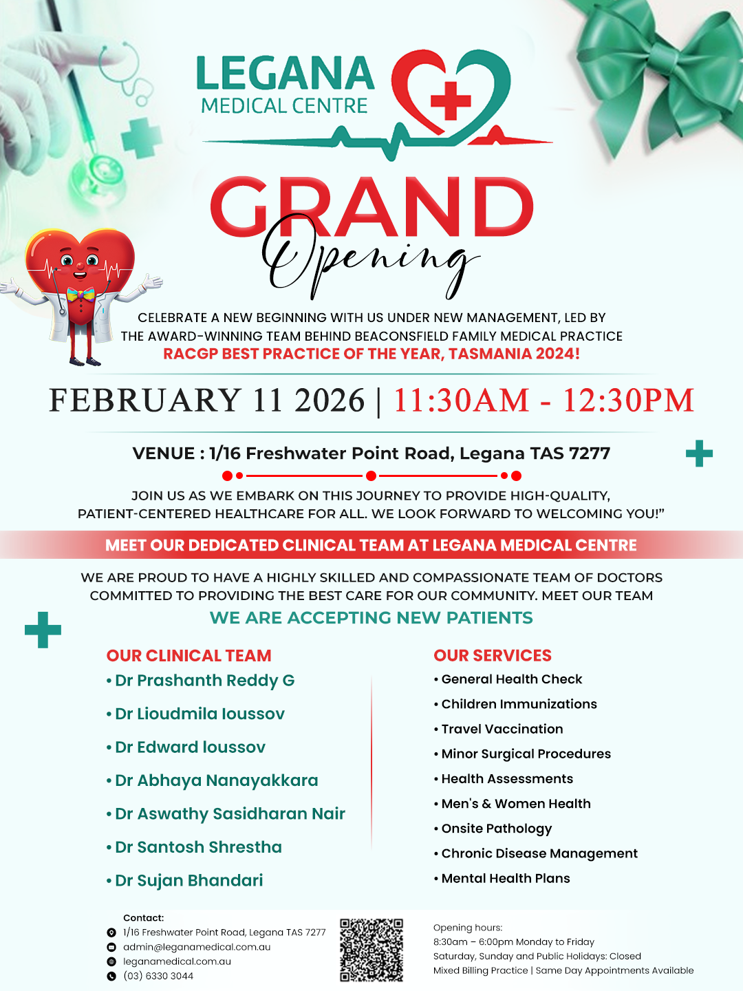 With a legacy worth celebrating and a future full of promise, Legana Medical Centre is excited to continue serving the Legana community with the same trust, compassion, and excellence you have come to expect—and more.